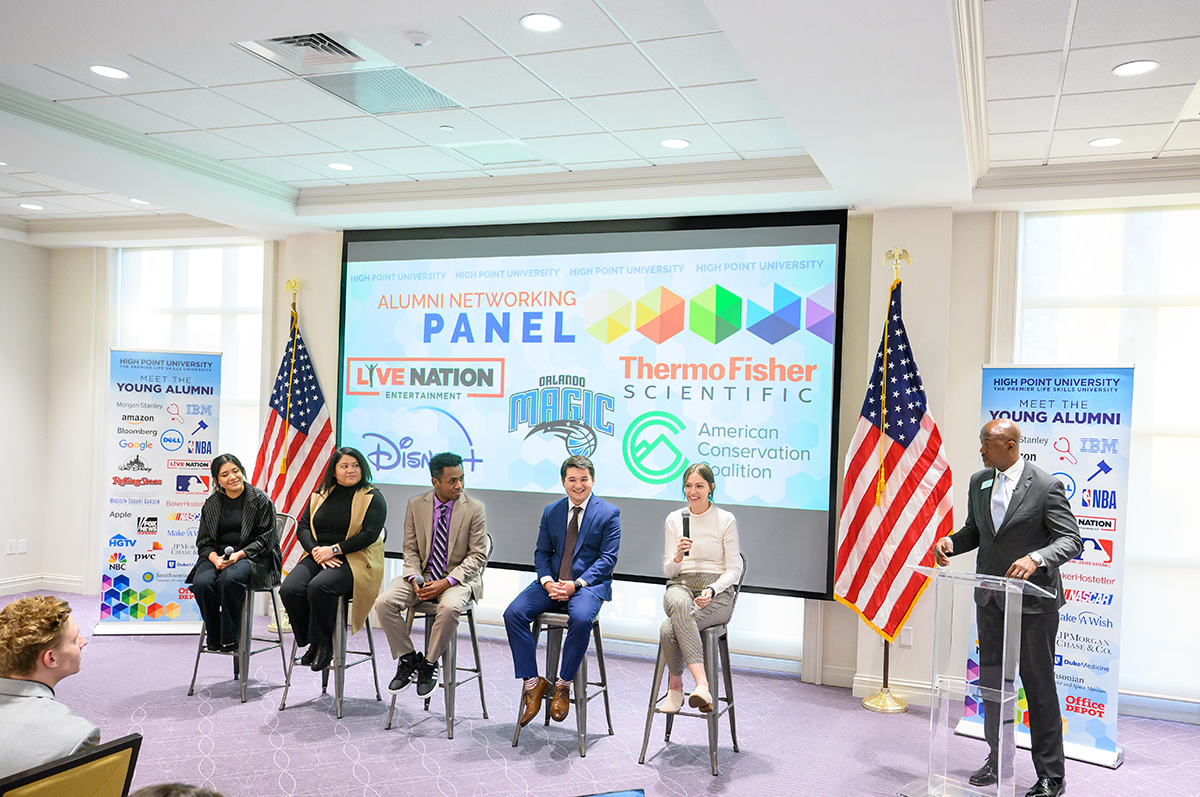 High Point University has been ranked #7 for Strongest Alumni Networks in LinkedIn’s inaugural Top Colleges list, a data-backed ranking of the 50 best U.S. colleges for long-term career growth. Pictured are young HPU alumni who work for nationally known companies and returned to participate in a panel discussion moderated by Dr. Doug Hall, HPU’s vice president of career and professional development.