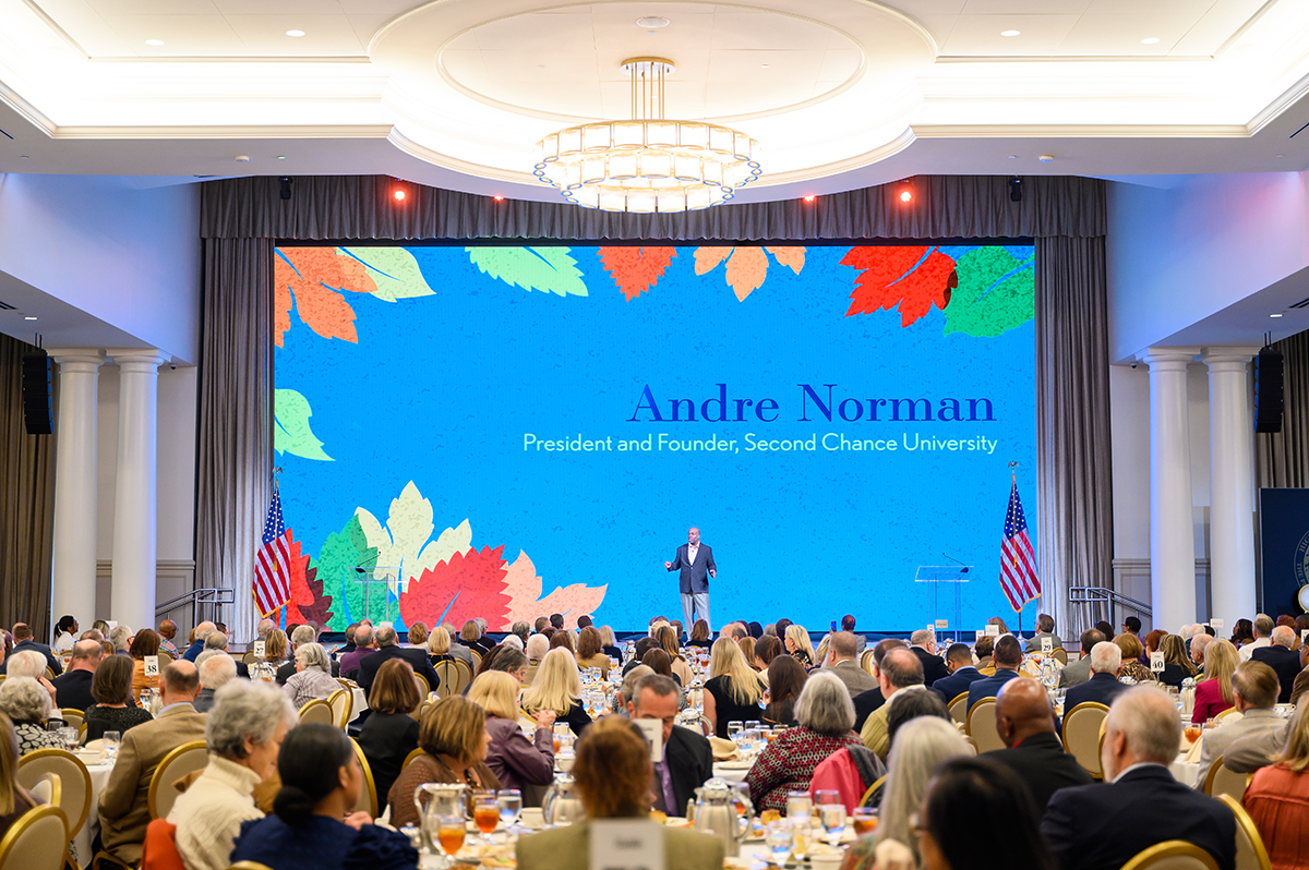 High Point University hosted the 36th annual Rotary Thanksgiving luncheon today at the Nido and Mariana Qubein Arena and Conference Center. Andre Norman, the president and founder of Second Chance University, spoke to approximately 800 people in attendance.