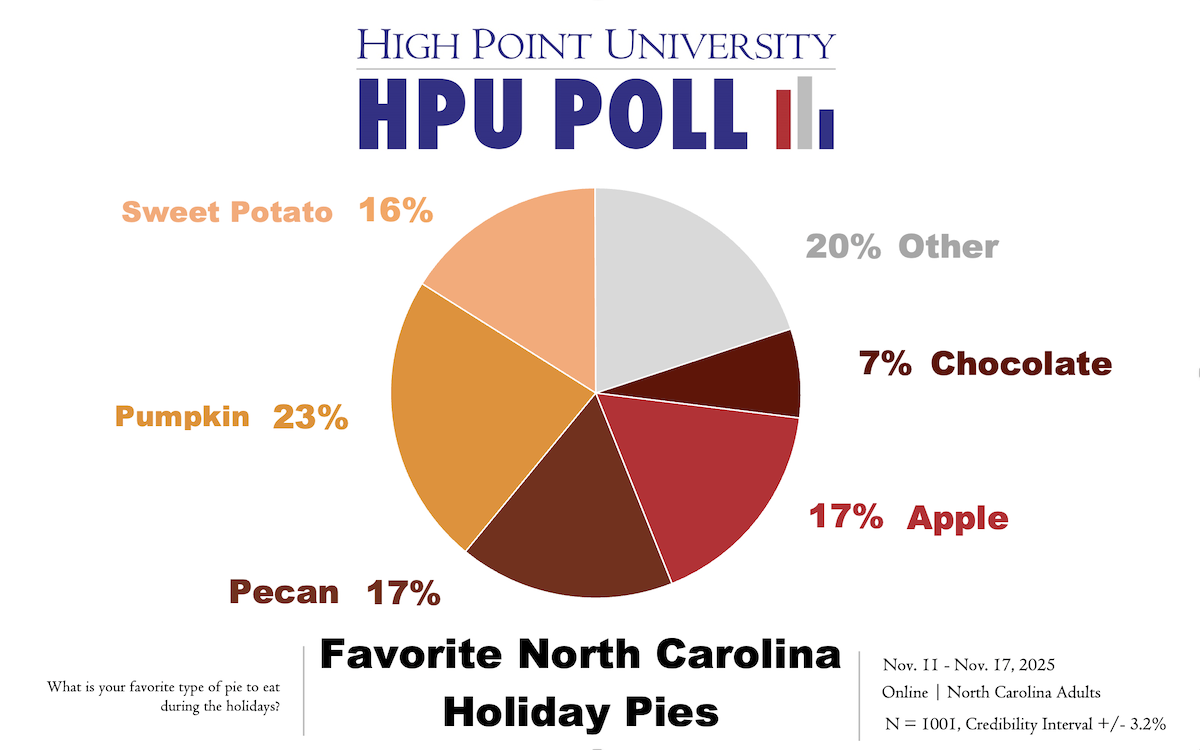 HIGH POINT, N.C., Nov. 25, 2025 – In the latest High Point University Poll, more United States residents (28%) and North Carolinians (23%) chose pumpkin pie as their favorite pie to eat during the holidays than any other type of pie.