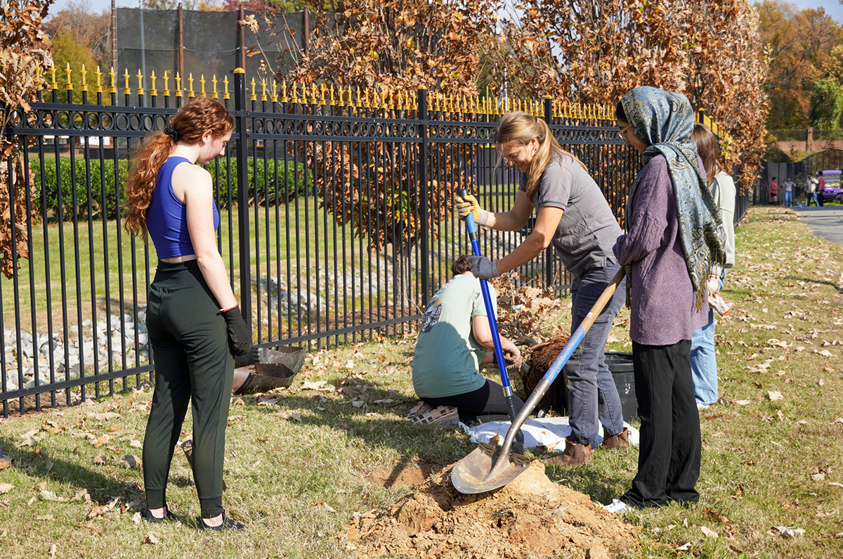 Twenty-two High Point University Natural Science Fellows rolled up their sleeves to plant 10 native oak trees on the section of the High Point Greenway that crosses through HPU’s campus. Juniors Gia Cicero, left, and Helia Osareh, right, learned proper excavation techniques from Emma Martone, curator of the Mariana H. Qubein Arboretum and Botanical Gardens.