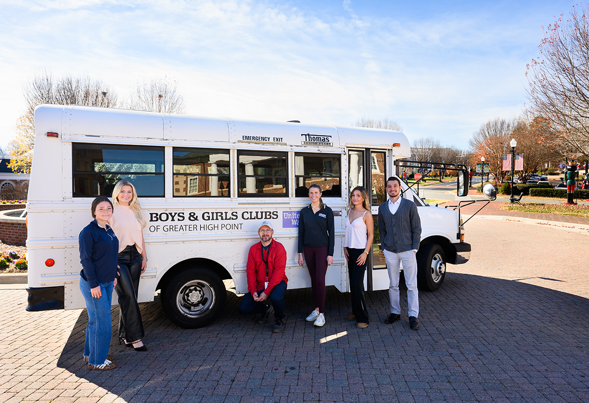 High Point University students are giving back to the community during this season of gratitude by raising funds and providing 100 Thanksgiving meals that can feed a family of four. Pictured from left were Savannah Miller and Ashlyn James, who are members of HPU’s Professional Selling Club, with Michael Henry, vice president of safety and sites for the Boys and Girls Club of Greater High Point, Katie Downing, Ava de Zagon and Jonathan Lazaridis after they loaded boxes into the bus.