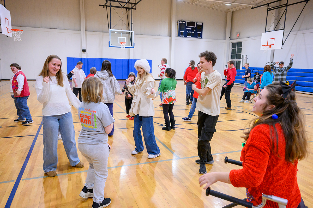 High Point University’s student chapter of the Council for Exceptional Children recently helped make the holidays brighter for community members with physical or intellectual disabilities. Cameran Brick, a sophomore political science major with a minor in secondary education, was pictured at left dancing with community members in the Nathaniel S. Morehead Recreation Center gym.