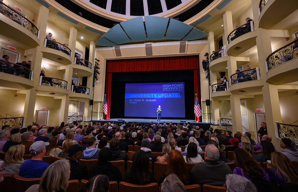 High Point University and the city of High Point bustled with students and their families during HPU’s Spring Family Weekend from Feb. 6-8. HPU welcomed more than 5,000 people to campus. Pictured are HPU families as they enjoyed hearing a University Update from President Nido Qubein in the Hayworth Fine Arts Center.
