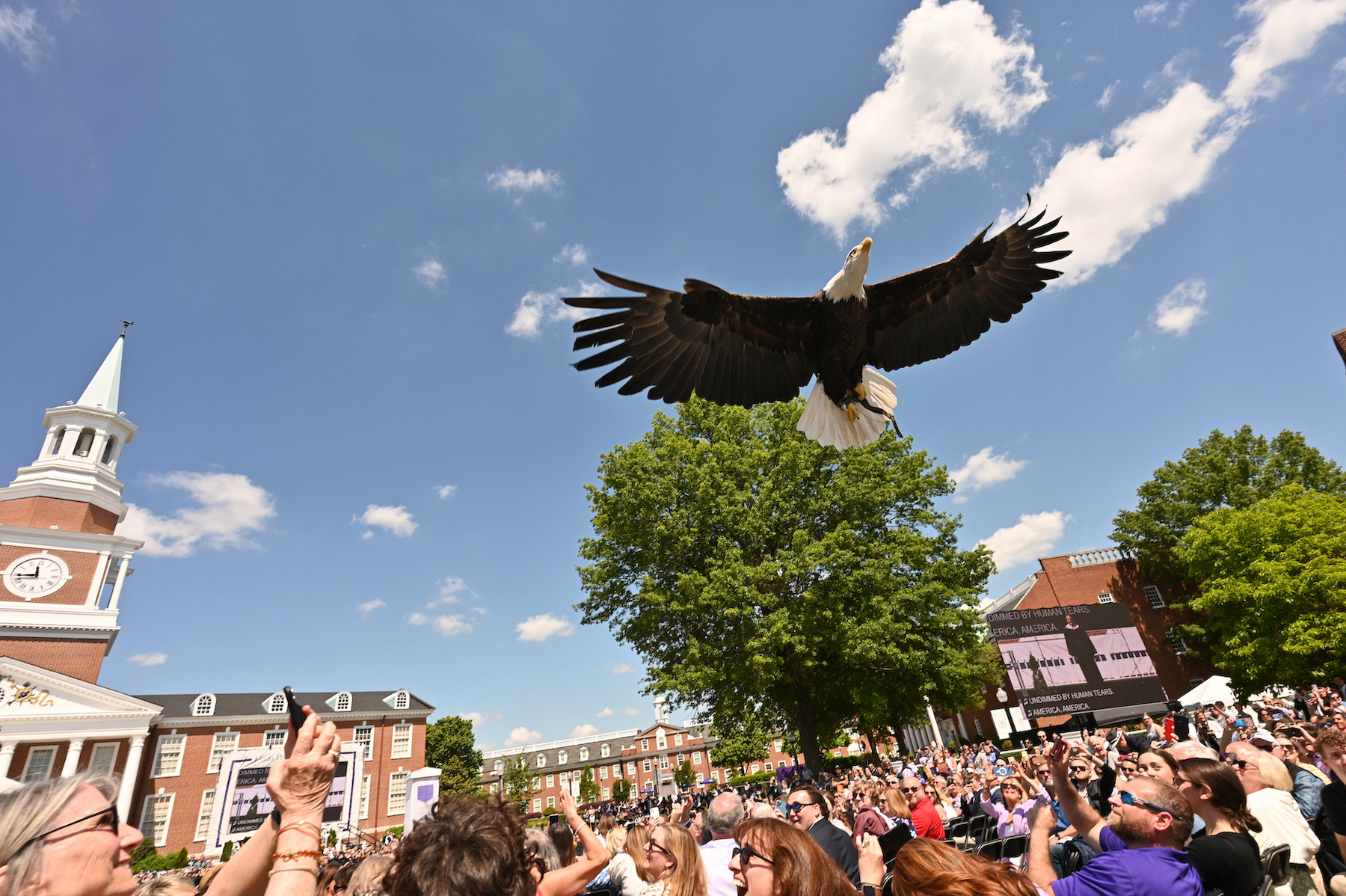 Each year, a bald eagle soars over HPU graduates during Commencement to represent the ideals of free enterprise, personal initiative and the ability to pursue new opportunities in America. Enjoy a video of this beautiful tradition from the 2023 ceremony.