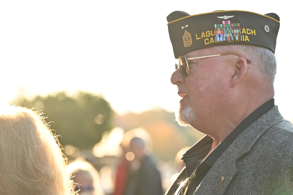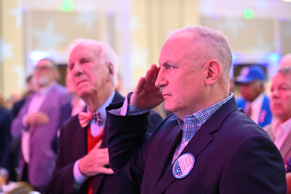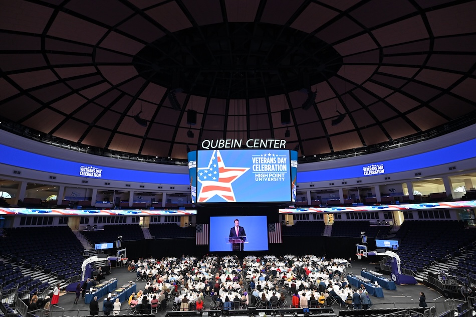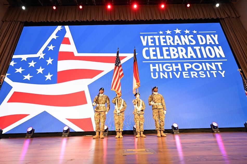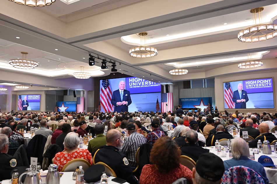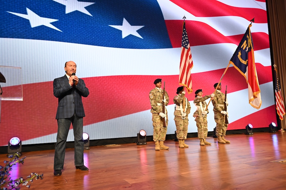 Grammy Award-winning singer Lee Greenwood, who serves as HPU’s Artist in Residence, performed “The Star-Spangled Banner” to open the program and closed it with his patriotic anthem “God Bless the USA.” He received a standing ovation during his final song, and moments later, a bald eagle named Clark soared over the crowd made up of veterans from every military branch.