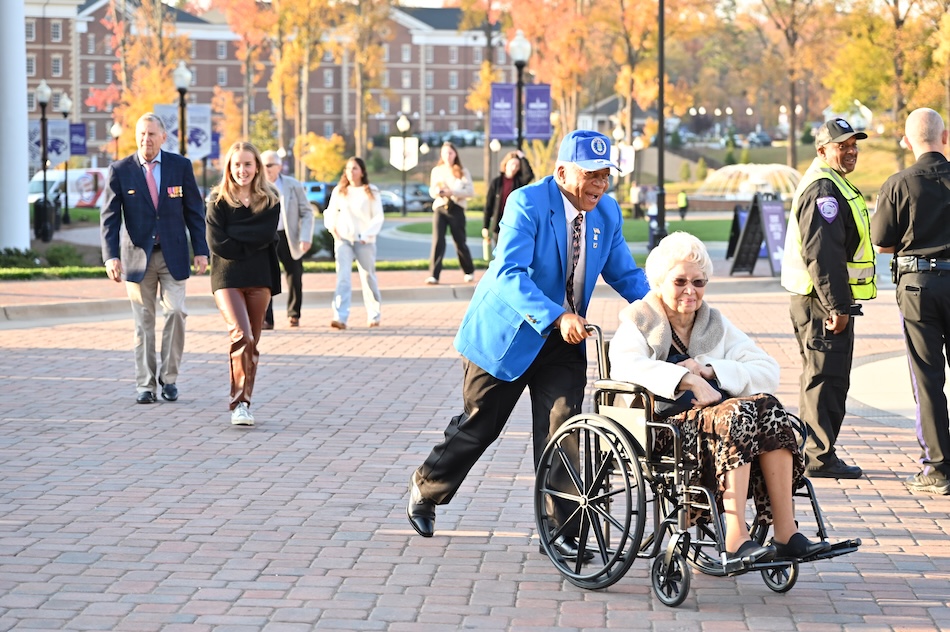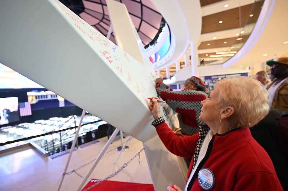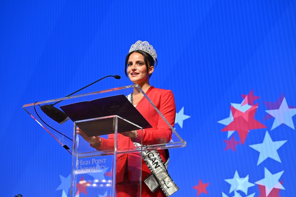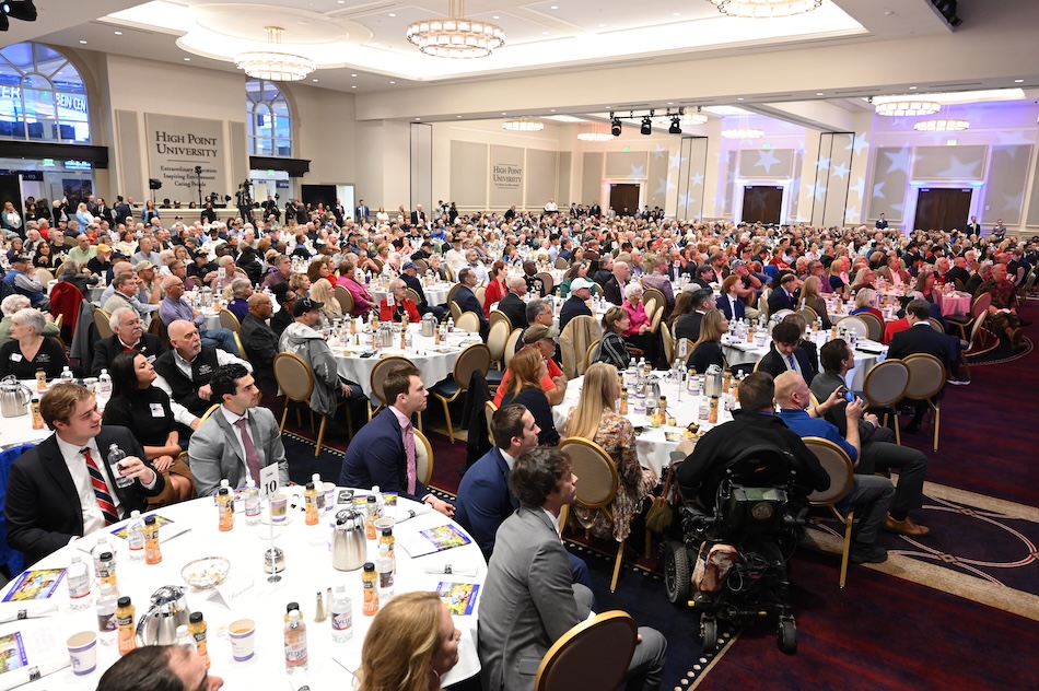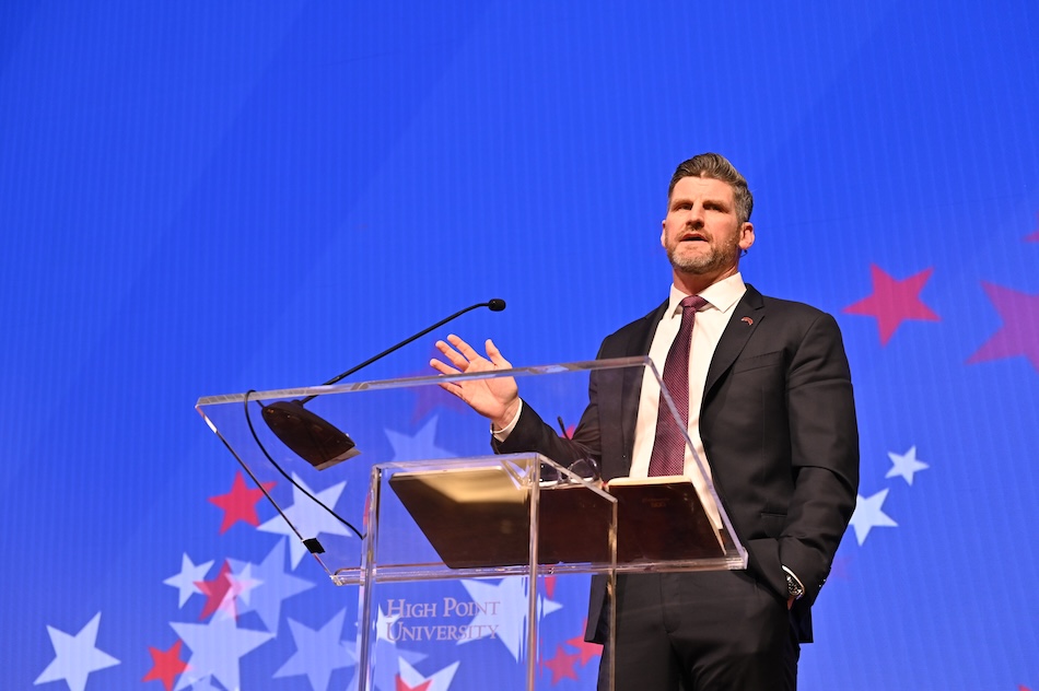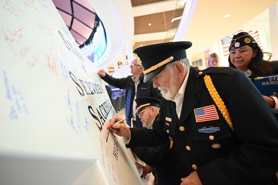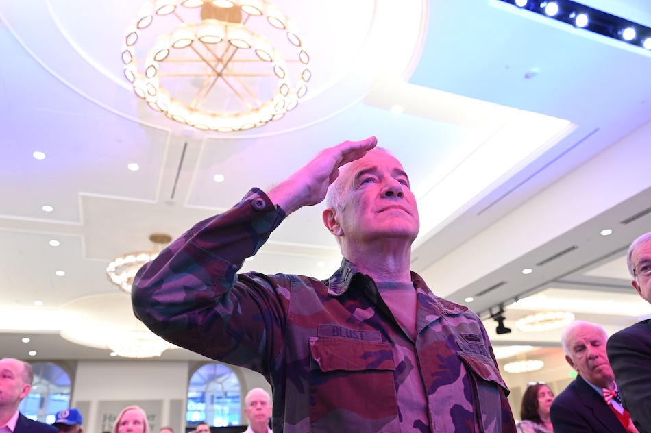 Grammy Award-winning singer Lee Greenwood, who serves as HPU’s Artist in Residence, performed “The Star-Spangled Banner” to open the program and closed it with his patriotic anthem “God Bless the USA.” He received a standing ovation during his final song, and moments later, a bald eagle named Clark soared over the crowd made up of veterans from every military branch.