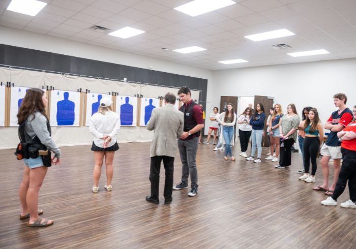 The Criminal Justice Learning Lab is a 9,000 square foot experiential learning facility used in justice related courses including Police Operations and Crime Scene Investigation. The Crime Lab is utilized to create mock crime scenarios for students to receive special investigative instruction and experience for processing a homicide scene as detectives, warrant-serving mock “busts” and “raids,” building searches for hidden and armed suspects, instruction on arrest procedures, and practicing officer safety, handcuffing and more. This Evidence Processing Room serves as an opportunity for students to: analyze physical evidence from a crime scene, such as fingerprints, footwear impression evidence, dust prints and blood splatter; learn investigational skills; interview witnesses, victims and suspects; learn basic law enforcement skills, like executing raids, approaching dangerous offenders, responding to emergency police calls; and appropriate use of force. The Lab includes a completely functional courtroom for use in teaching students about aspects of criminal trials, legal issues, and for students to play parts in mock trials.