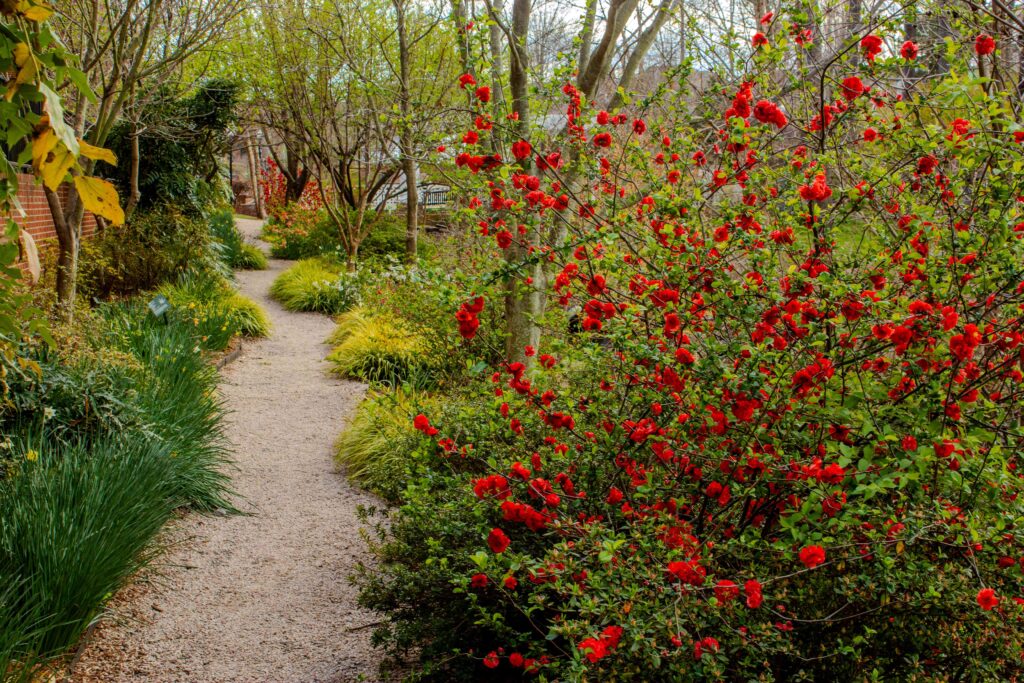 About: This shady, winding path was created in 2009 with plants generously donated by Pender Nursery, Brent & Beck’y Bulbs, and Flowerwood Nursery. More than 130 different azaleas grow along the walkway, and by the second week in April, the path is awash in ruby red, purple, and pink. Winding its way around the Slane Center, this garden offers a colorful contrast to the neighboring ponds and splashing fountains. The section behind Slane has colorful late fall-blooming perennials, while the section behind Blessing Hall features spring blooming trees and shrubs.
