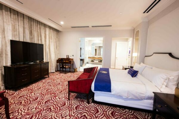 At over 475 square feet, the Superior King Guestrooms at the Kahn Hotel welcomes guests to spacious and luxurious accommodations featuring a plush king-size bed with crisp Matouk linens. In addition to a casual sitting area and a large desk, these rooms also offer a spa-inspired marble guest bathroom complete with a delightful collection of L'Occitane soaps, lotions and shampoo.