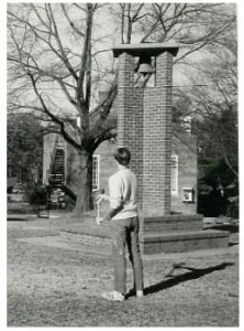 There was another school supported by the Methodist Protestant Church that predates the founding of High Point College. In 1856, students of Yadkin College found themselves attending school on the banks of the Yadkin River in remote Davie County at Yadkin College, classes in the liberal arts were at the forefront with courses in languages, religion, philosophy, and the sciences. This pre-Civil War institution was similar to others across the country at a time when private higher education in the United States was in its infancy. For example, Davidson College and Guilford College were both founded in 1837 and Trinity College, which would later become Duke University, traces its origins to 1838. These small colleges were unique institutions at the time. So unique that in the 1850s only 200 or so of these private liberal arts colleges existed in the United States. Unfortunately, Yadkin College would not endure and closed its doors as the first students walked to class at High Point College. Alumni of Yadkin College made High Point College their new home. The Yadkin College bell (see picture) was installed at High Point College as the victory bell. Today the same bell has an honored spot on the High Point University campus next to Finch Dorm.
