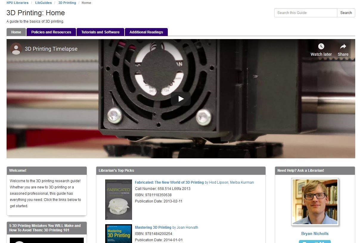 T.) Three-Dimensional Printing (3D Printing)- Also referred to as “additive manufacturing”, 3D printing is a method of printing that produces a physical object instead of an ink and paper copy. You can learn more on our 3D printing libguide or ask about our 3d printer in Media Services on the lower level of Smith Library.