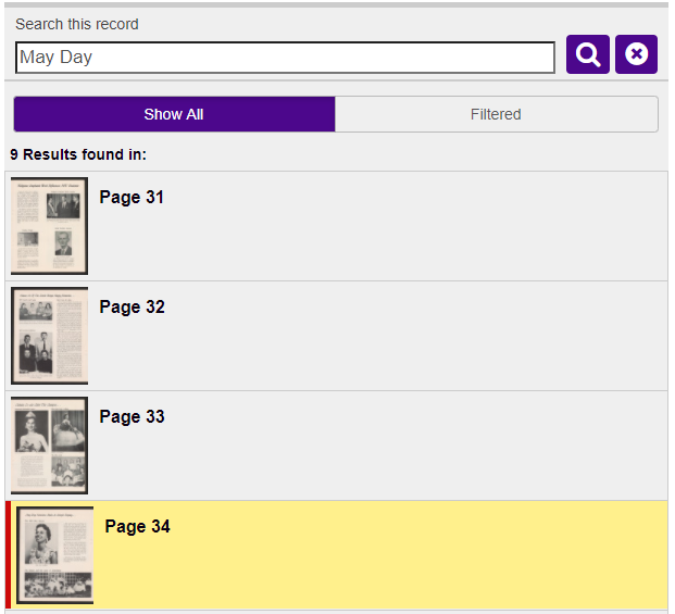 - Exploring the Object Page: Object pages may include one document, such as a single scrapbook, or several documents grouped together, like the Commencement Programs 1960s-70s. For single items with multiple pages, click the thumbnail on the right hand side to view that page. For items that include several documents, select the document you are interested in from the list on the right hand side, then click the enlarged image to scroll through the pages of the document you’ve selected. You can search the text of the object using the search bar at the top of the thumbnail list. If you have already used the main search bar, that term will be entered automatically.