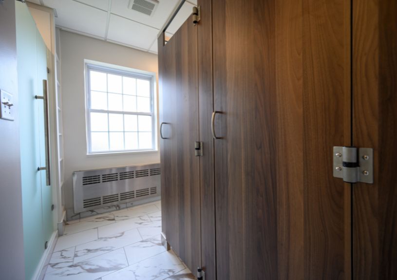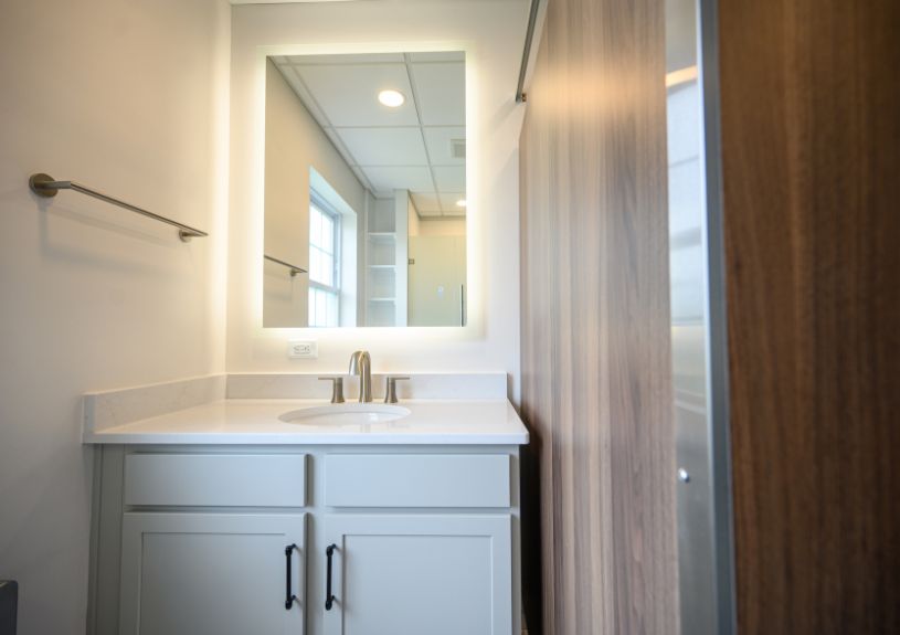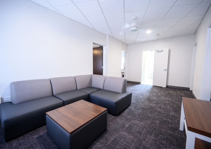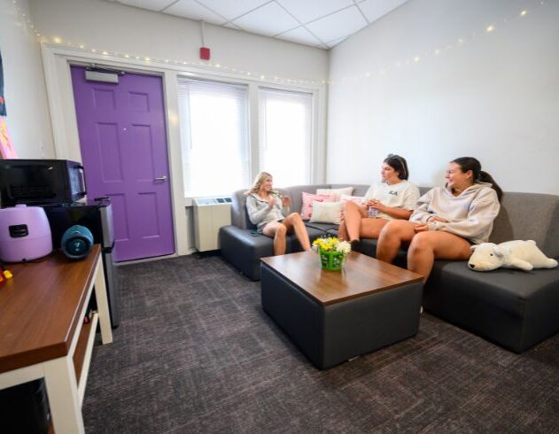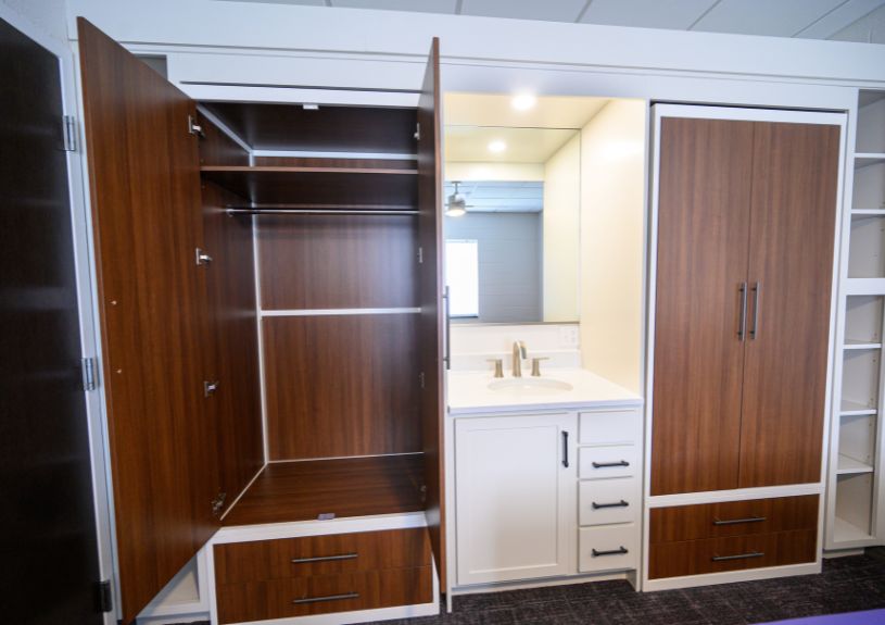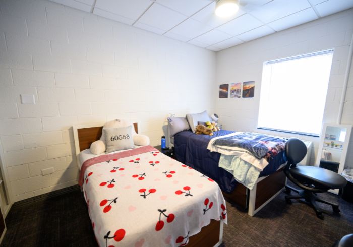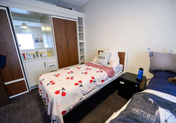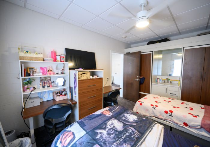 The suites in Belk are either 4 bedrooms or 3 bedrooms (either 6 or 8 students). Each suite in Belk residential community has an entrance from an outside balcony-walkway, four bedrooms, a lounge area and a shared bathroom. Two students share each room, making a total of eight students sharing a bathroom. Each room is furnished with two bunkable standard size twin beds, two closets, and a built-in desk unit with drawers, two desk chairs, ceiling fan and carpet.